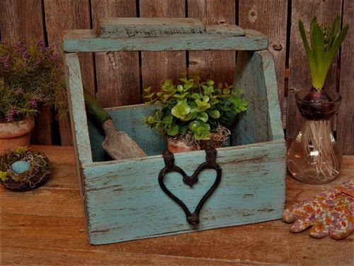 Title (ebay affiliate link): Antique Primitive Teal Rustic Wood Box w/ Cast Iron HEART Repurposed Garden Tote