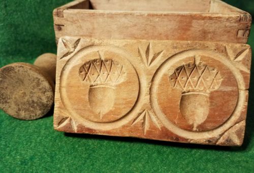 Title (ebay affiliate link): Antique Rectangular Wooden Butter Mold Press 2 Acorn design Dovetailed