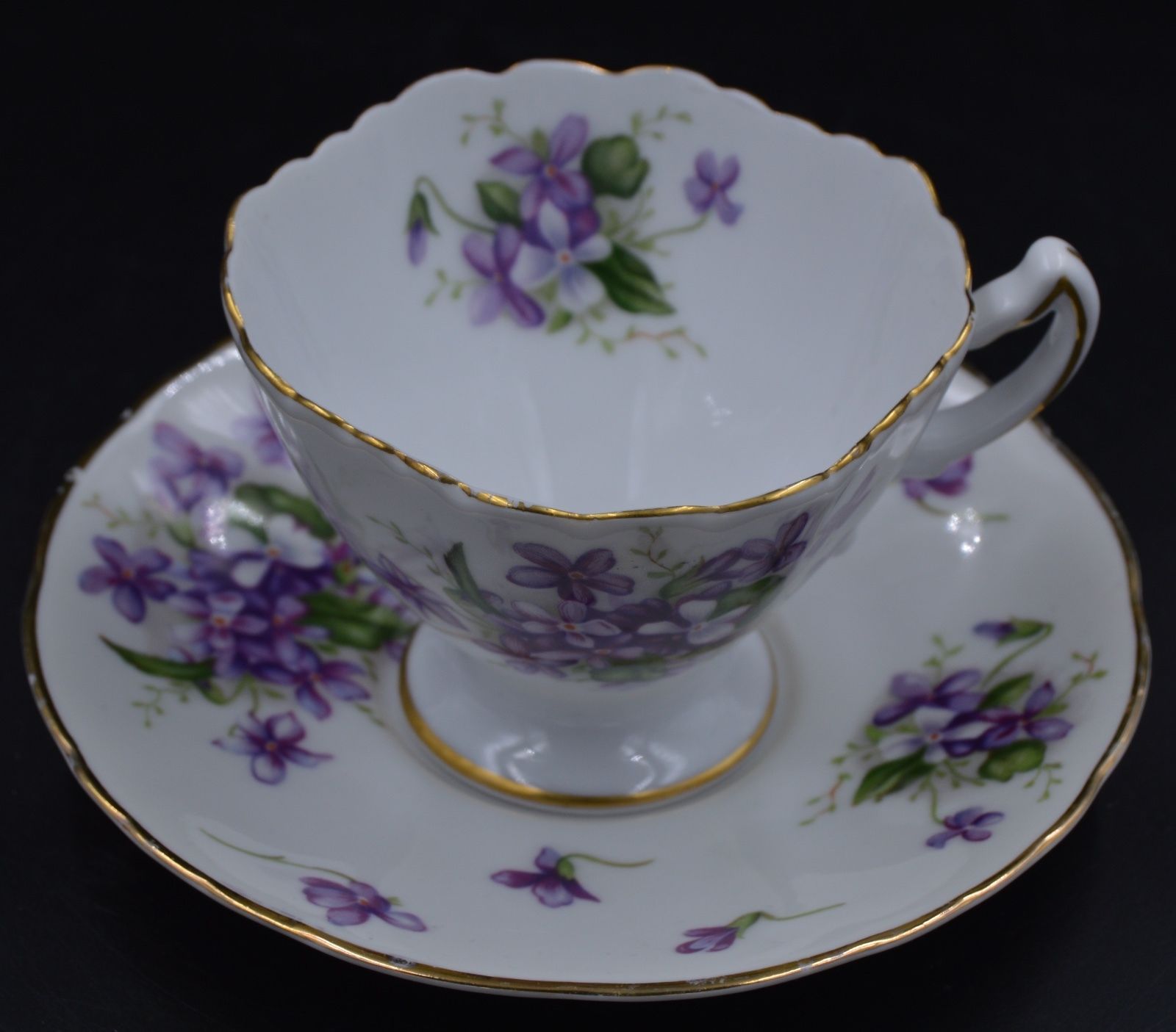 Title (ebay affiliate link): Vintage Rossetti Chicago Cup and Saucer Footed Cup Purple Violets Gold Trim