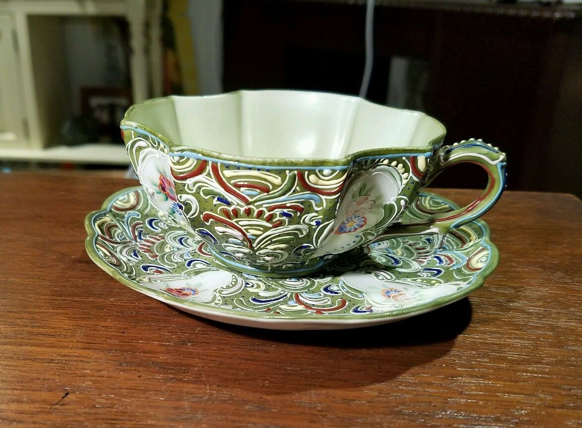 Ardalt Japan Handpainted Green Enamel Moriage Teacup & Saucer #6327