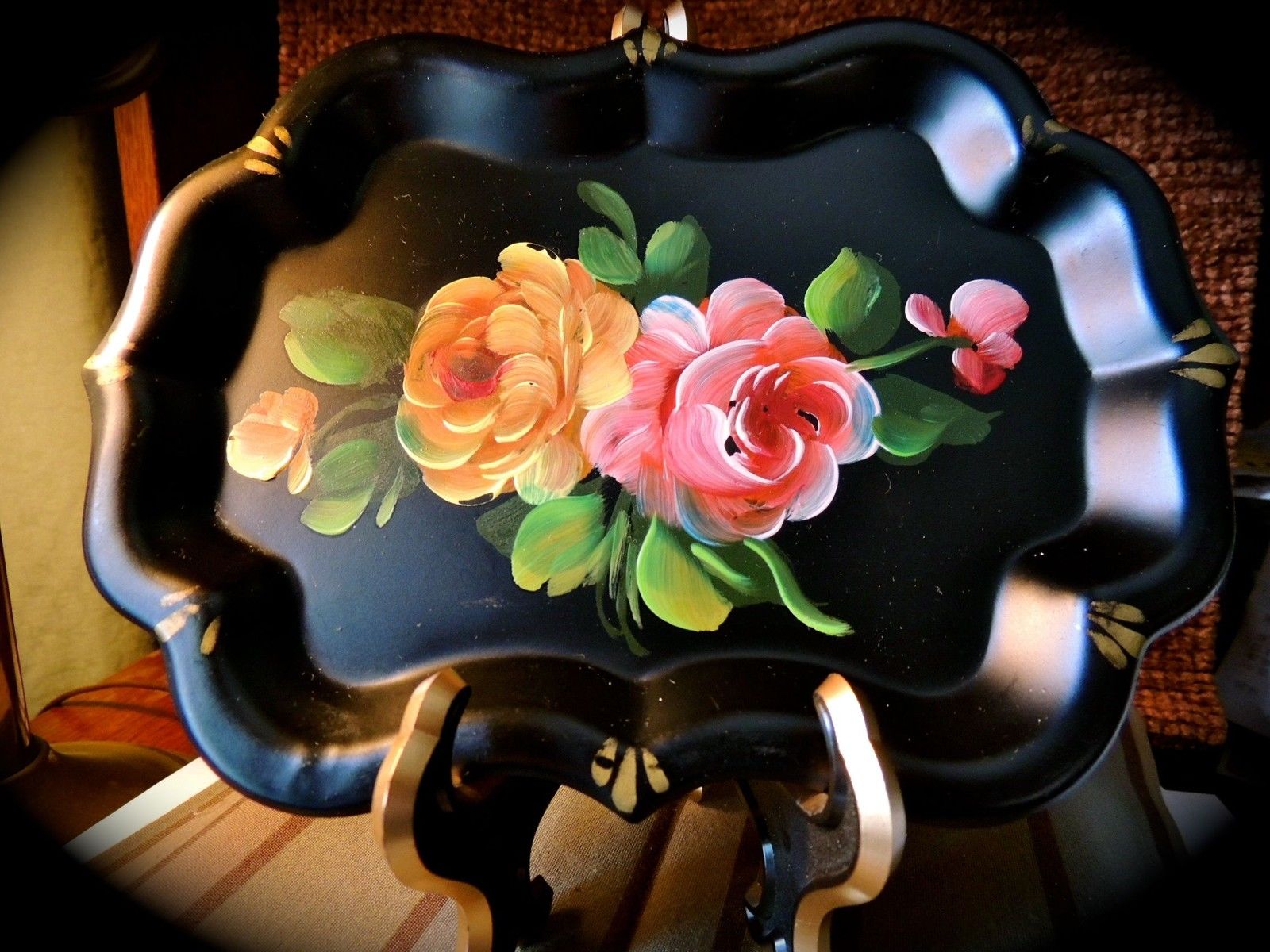 Title (ebay affiliate link): Vintage Toleware Tip/Tidbit Tray Black with Roses and gold accents