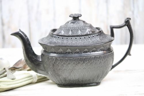 Title (ebay affiliate link): Antique Ceramic Black Basalt Teapot Intricate Design Acanthus Leaf Floral Finial