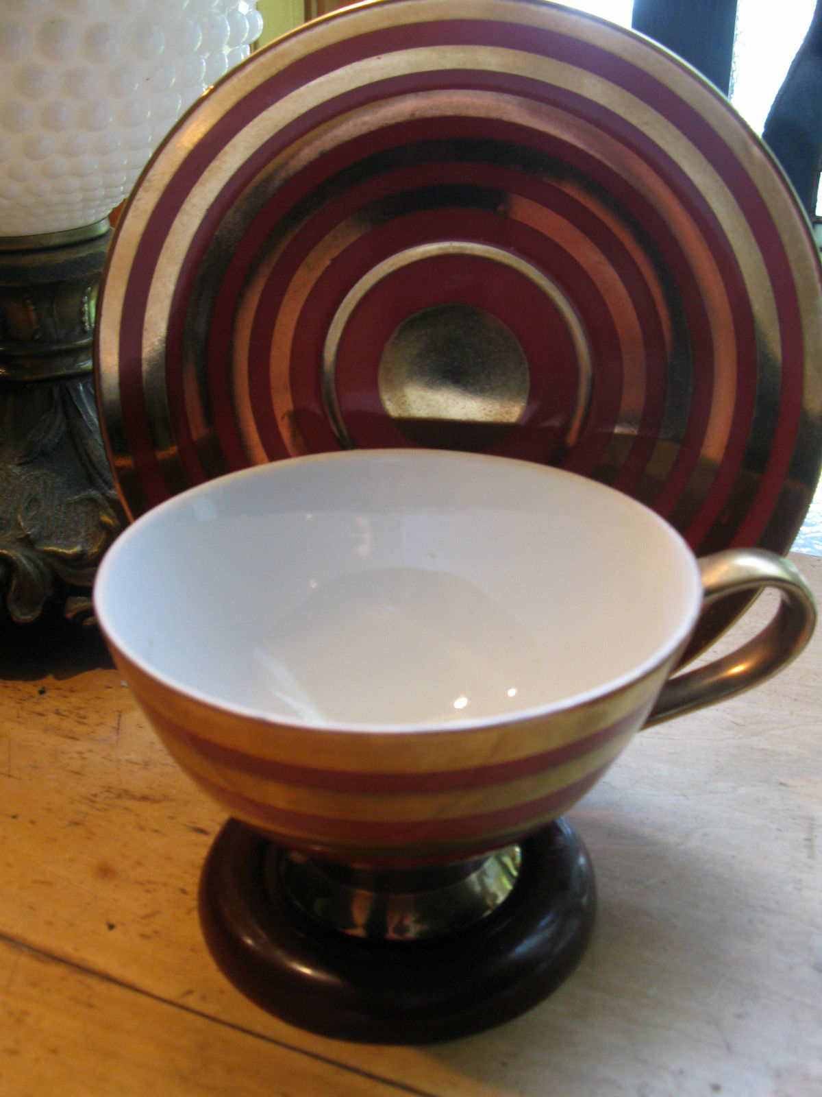 Title (ebay affiliate link): VINTAGE STUNNING SHAFFORD FOOTED TEA CUP AND SAUCER DEEP RED AND GOLD