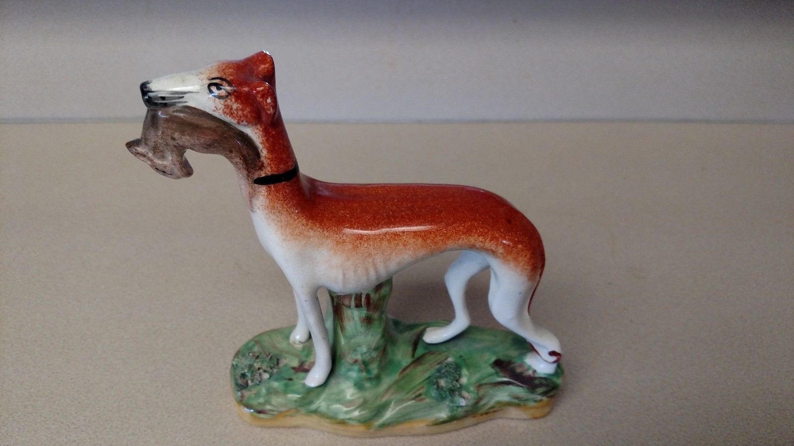 BEAUTIFUL RARE STAFFORDSHIRE HOUND WITH SQUIRREL IN IT''S MOUTH