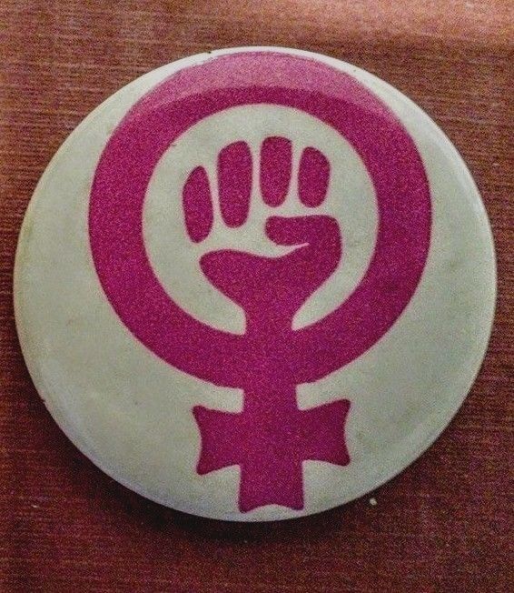 Title (ebay affiliate link): FEMALE EQUALITY SIGN WITH FIST- Maroon/Gray - Womens Liberation 1973 Button