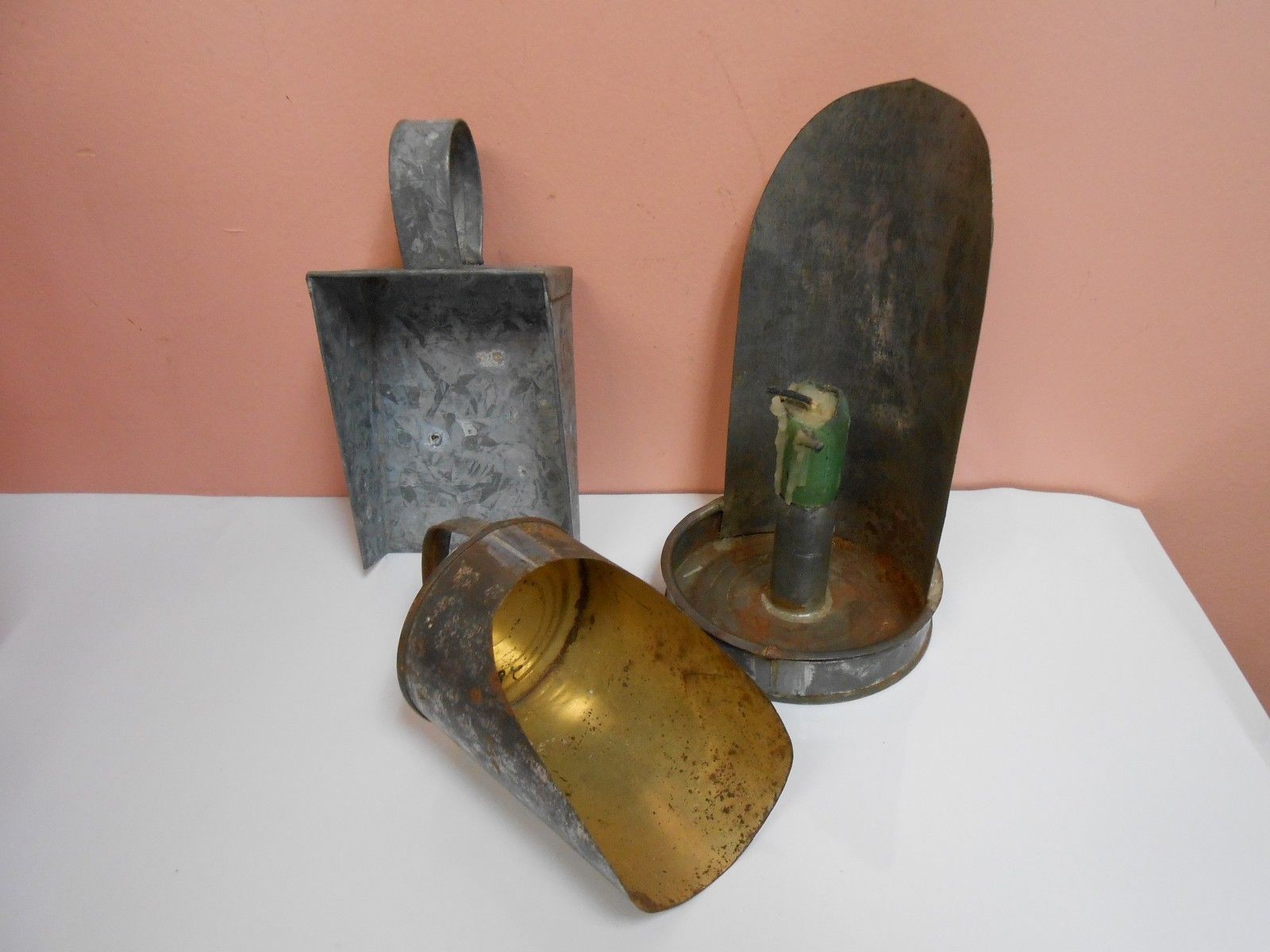 Title (ebay affiliate link): 3 Vintage Antique Hand Made Tin Candle Holder, Scoop, Galvanized Steel Scooper
