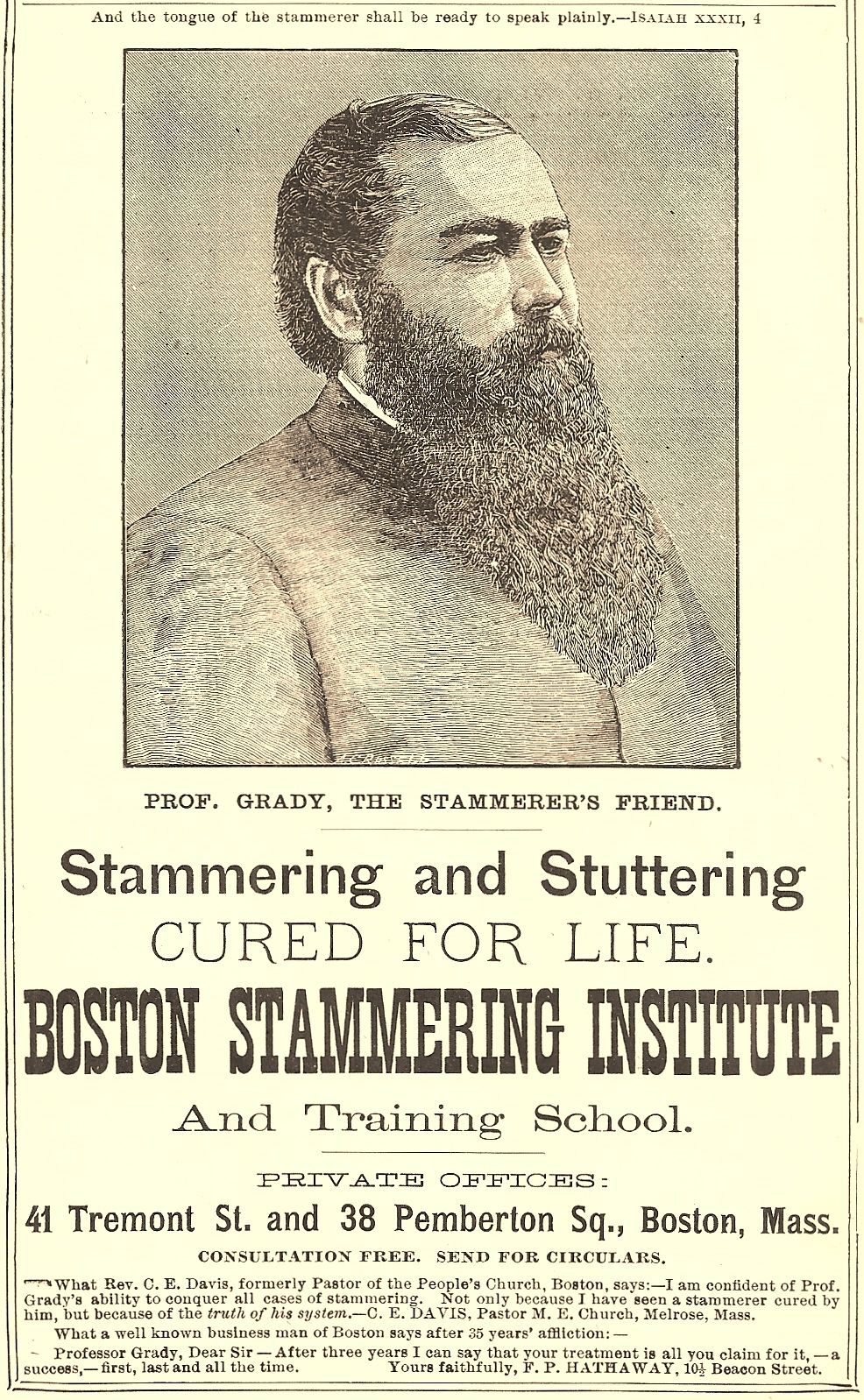 1889 PROF. GRADY, BOSTON STAMMERING INSTITUTE STUTTERING CURE-ALL ADVERTISEMENT