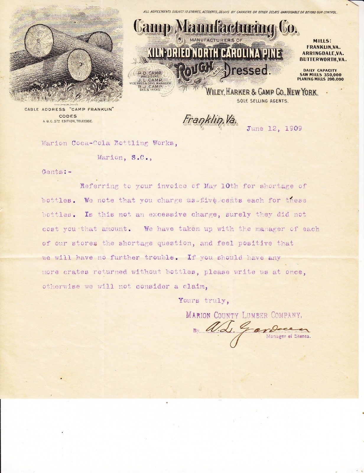 CAMP MANUFACTURING CO. LETTERHEAD DATED JUNE 12, 1909 INTERESTING READING