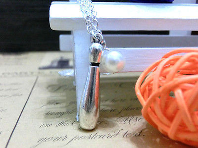 Title (ebay affiliate link): Antique silver Bowling bottle & pearl ball charm handmade chain necklace pendant