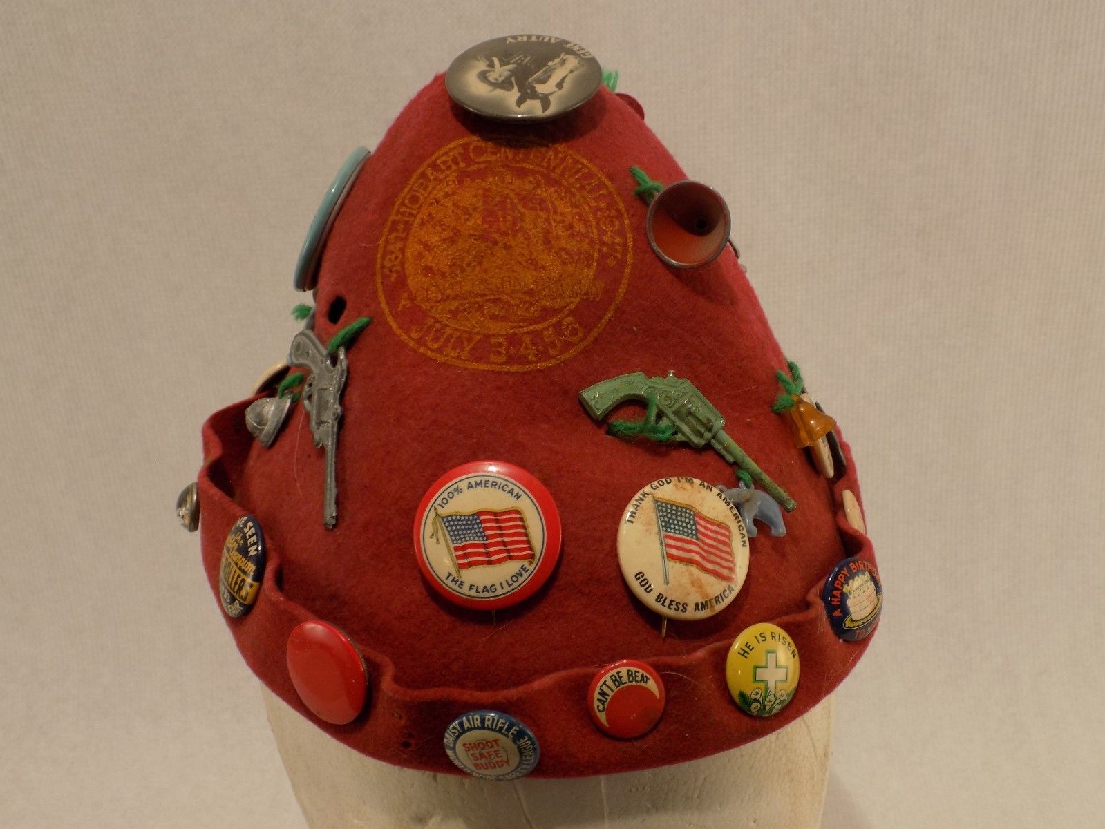 1947 Hobart Centennial Childs Felt Hat w/ Vintage Pinbacks and Cracker Jack Toys