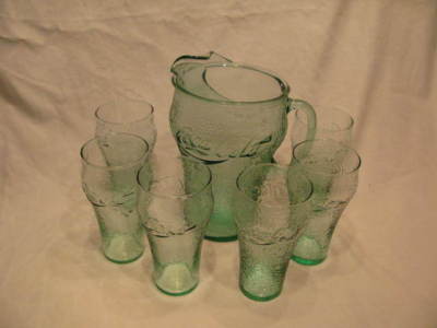Title (ebay affiliate link): 7 pc Coca Cola green glass pitcher and tumbler set Coke