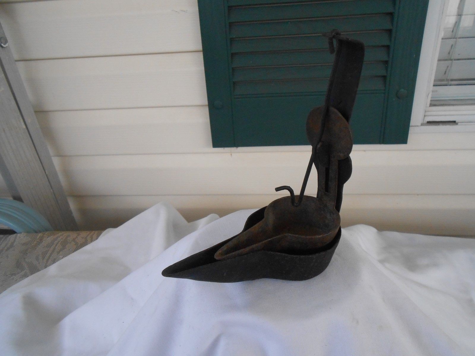 Title (ebay affiliate link): Early Double Pan Betty Lamp for Fat, whale oil, grease; Forged Iron/Metal Good