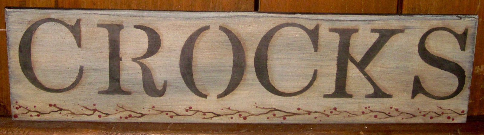 *~*PRIMITIVE*~*HP FOLK ART PRIM "CROCKS" SIGN *~* VINE OF BERRIES *~* BOARD
