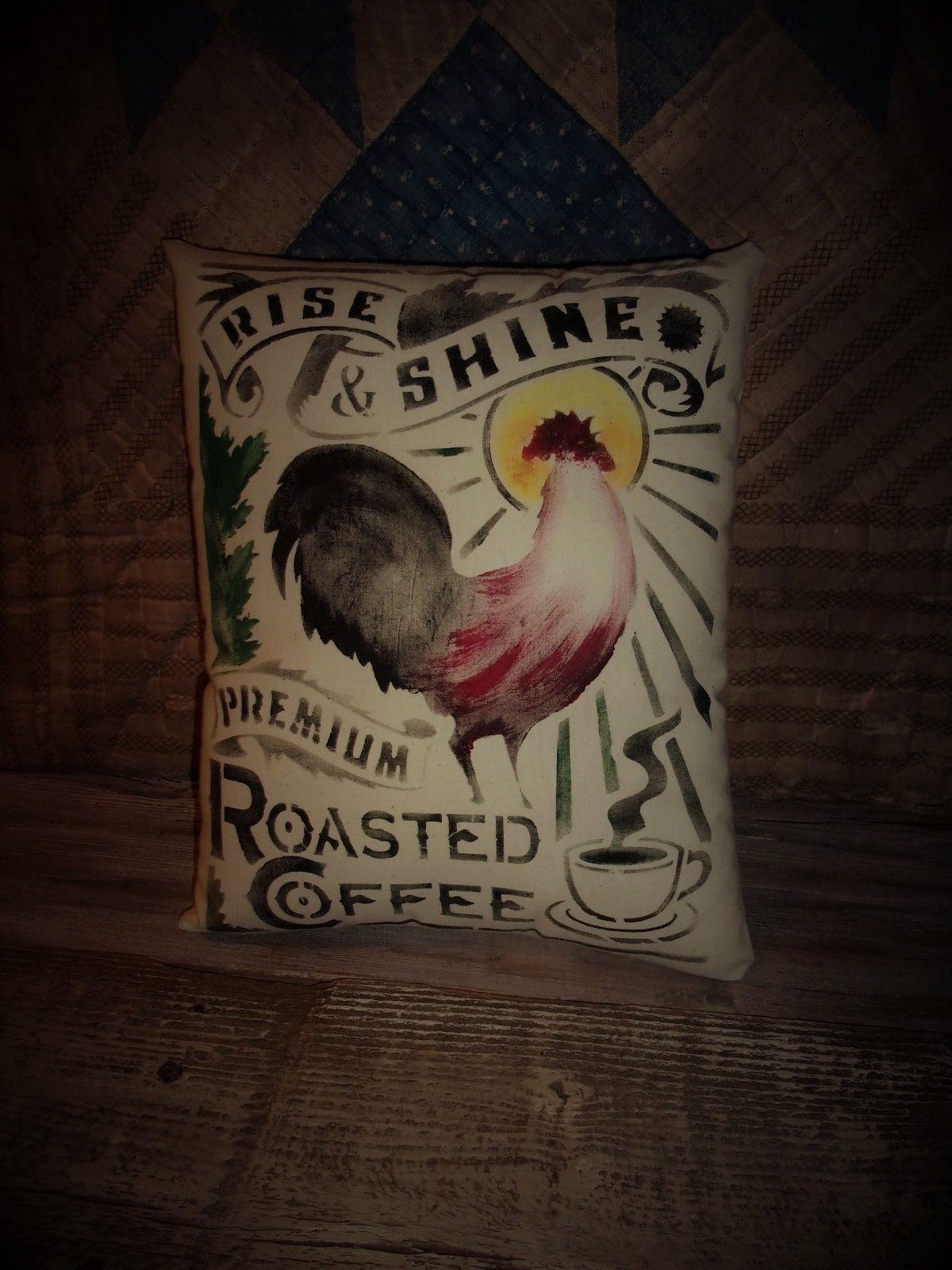 ** Primitive 9x11in Hand stenciled PILLOw w/ rooster Country Rusty doll B5**