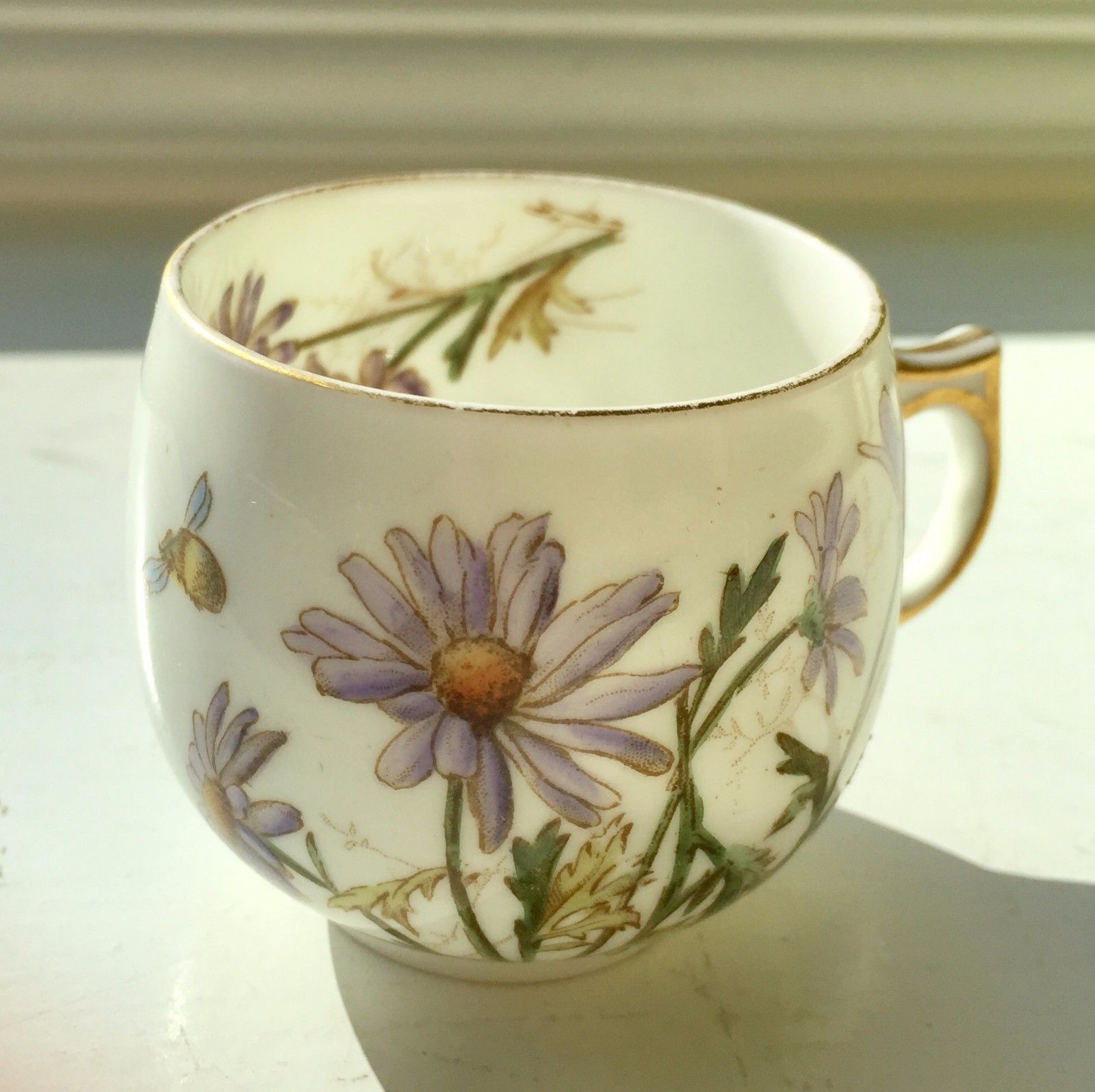 Title (ebay affiliate link): Antique English Fine Porcelain Demitasse Cup Bumble Bee & Purple Aster Flowers