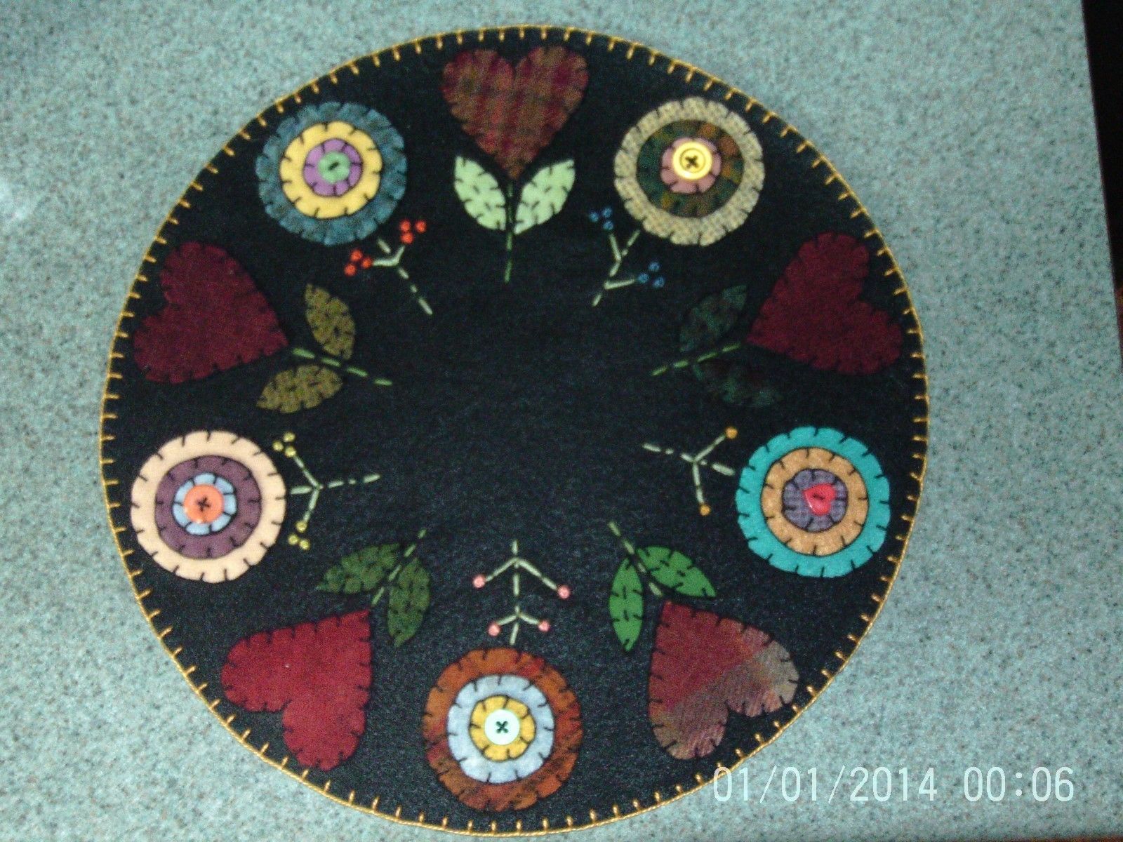 Title (ebay affiliate link): Handmade Penny Rug Candle Mat 12 inch Hearts and Flowers Garden