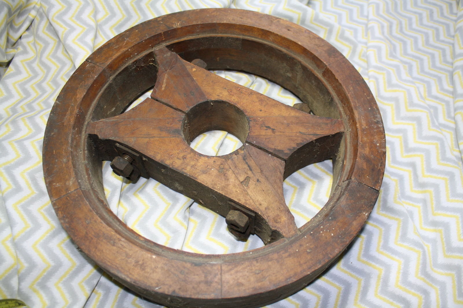 Title (ebay affiliate link): ANTIQUE 15" FLAT PULLEY WHEEL WOOD PRIMITIVE FACTORY SHIP BARN STEAMPUNK