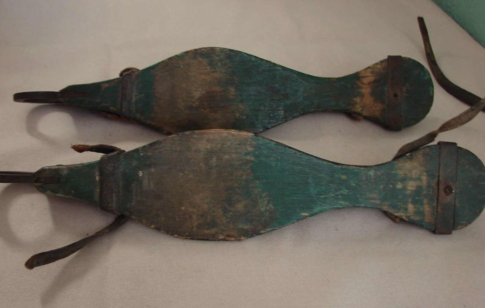 1800s Antique Womens Ice Skates 12" Stamped Iron Curly Tips & Green Painted Wood