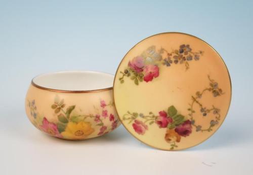 Title (ebay affiliate link): c. 1908 Royal Worcester Pink Roses Flowers Blush Ware Jar Box Antique Porcelain