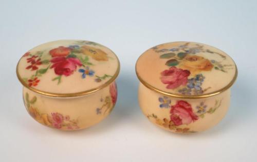 c. 1900 PAIR Antique Royal Worcester Roses Flowers Blush Ware Pill Box Porcelain