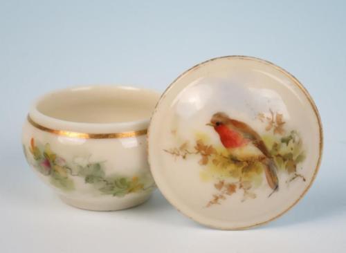 Title (ebay affiliate link): c. 1890 Grainger & Co. Worcester HP Bird Porcelain Pill Box Royal China Antique