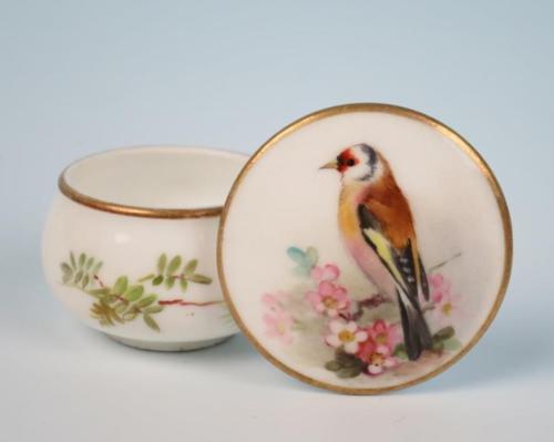Title (ebay affiliate link): Antique Royal Worcester Hand Painted Bird Pill Box Miniature Porcelain Trinket