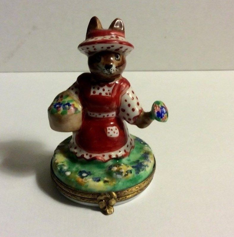 France Limoges Hand Painted Bunny Rabbit Red Dress Flower Basket Trinket Box