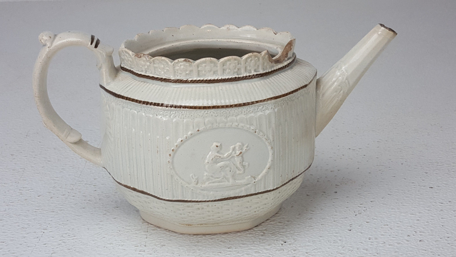 Antique Relief Molded Pearlware Teapot Eagle Woman Cupid Brown Paint