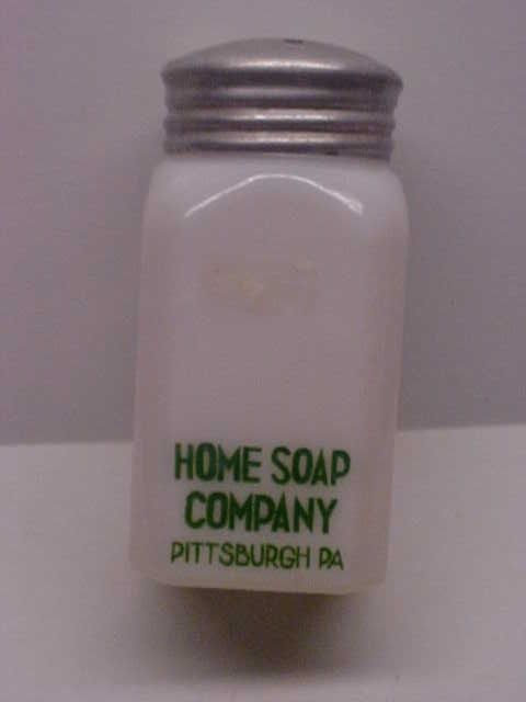 VNT HAZEL ATLAS HOME SOAP COMPANY-PITTSBURGH,PA. ADVERTISING MILK GLASS SHAKER