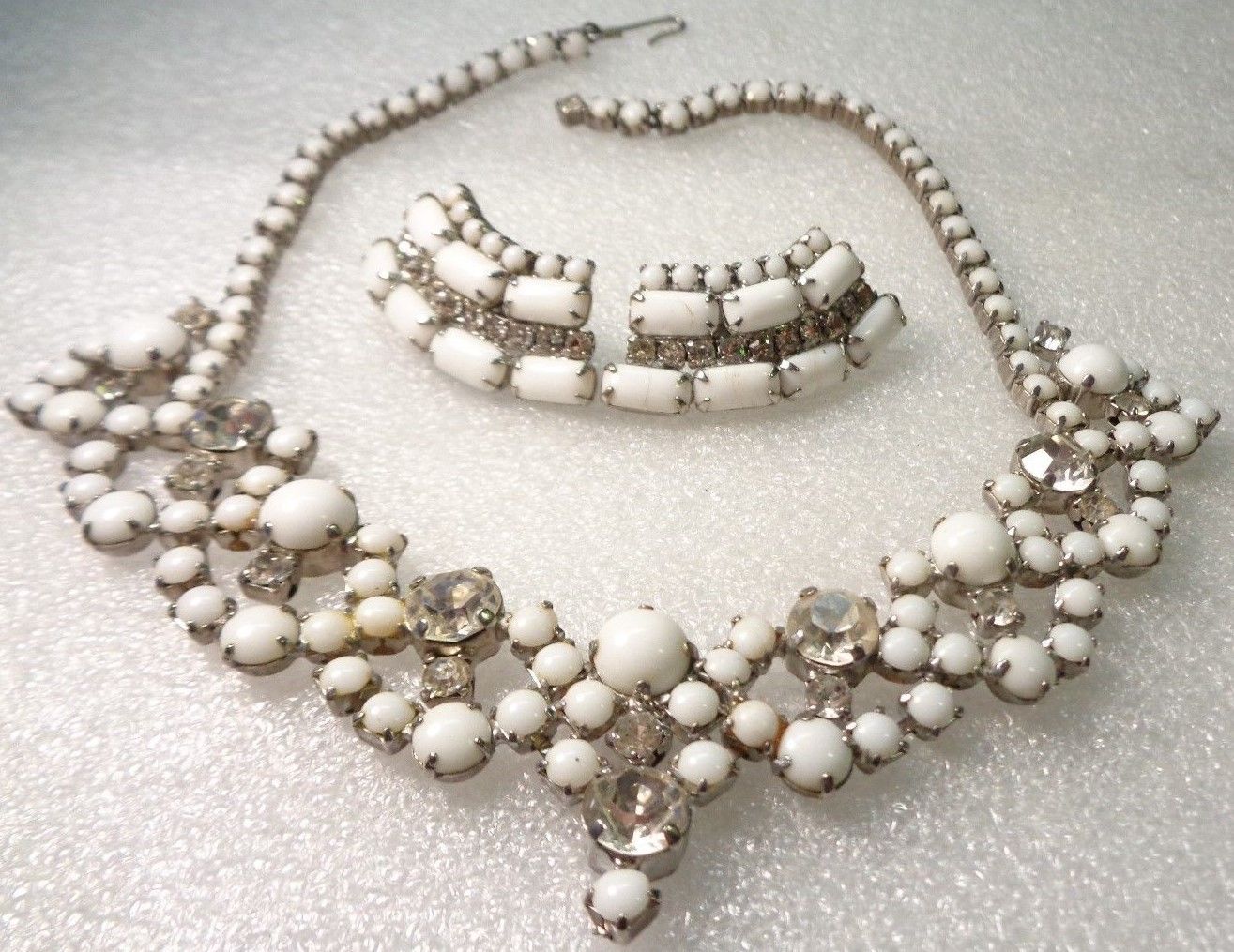Title (ebay affiliate link): Vintage Art Deco White Milk Glass Cabs & Clear RHINESTONE Necklace & Earrings