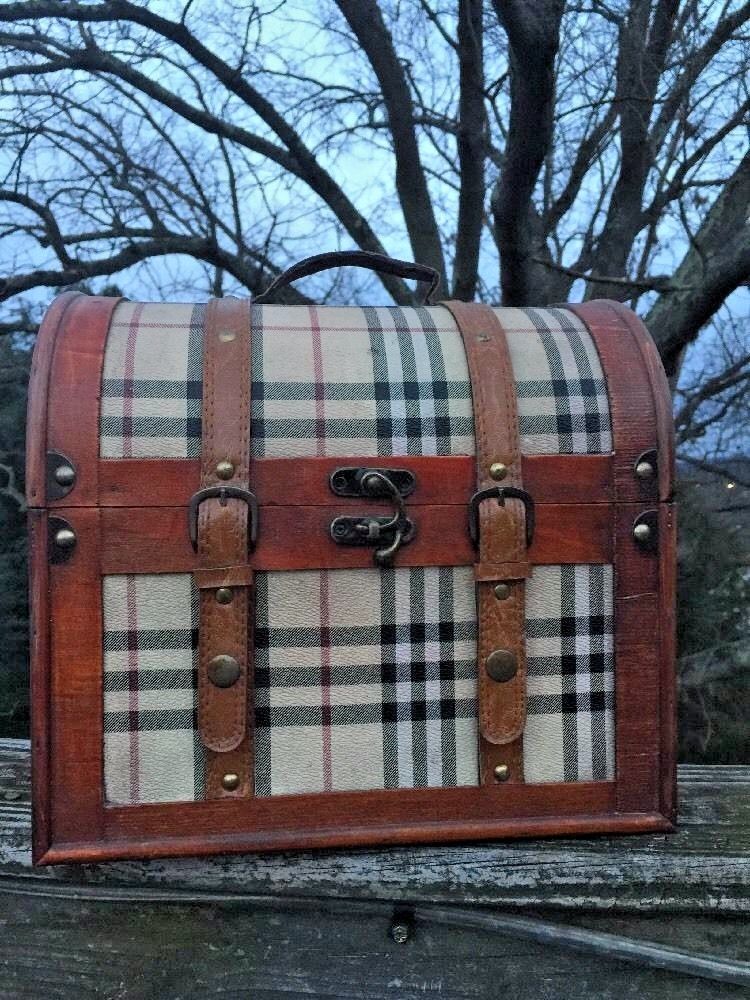 Title (ebay affiliate link): Antique PRIMITIVE Horse Saddle Burberry Plaid Round Top TREASURE CHEST Trunk Box