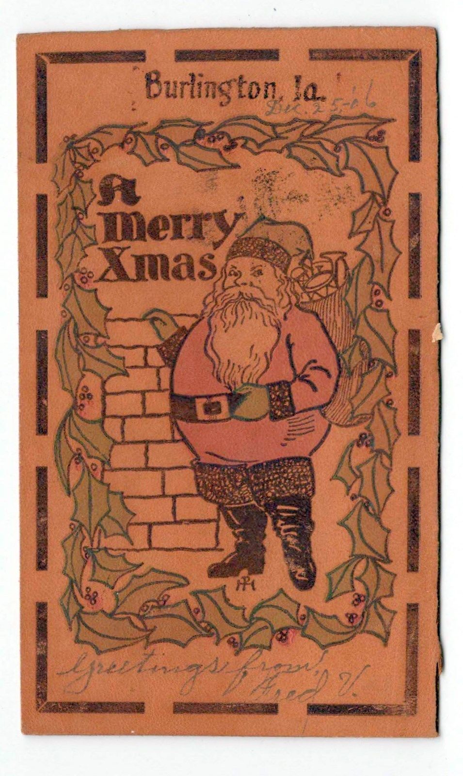 Antique Leather Postcard A Merry Xmas Santa Burlington Iowa 1906