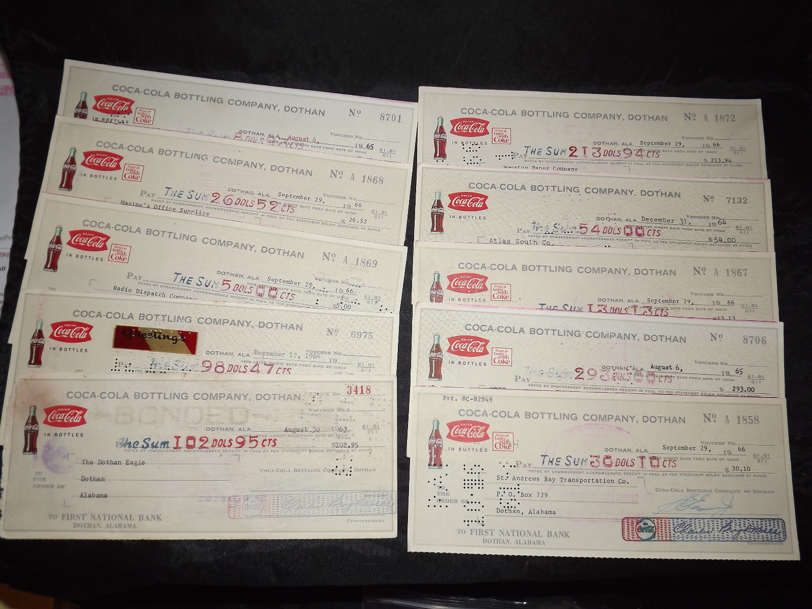 Title (ebay affiliate link): 1963- 1966 LOT OF 10 COCA-COLA BOTTLING COMPANY COKE DOTHAN ALABAMA BANK CHECKS