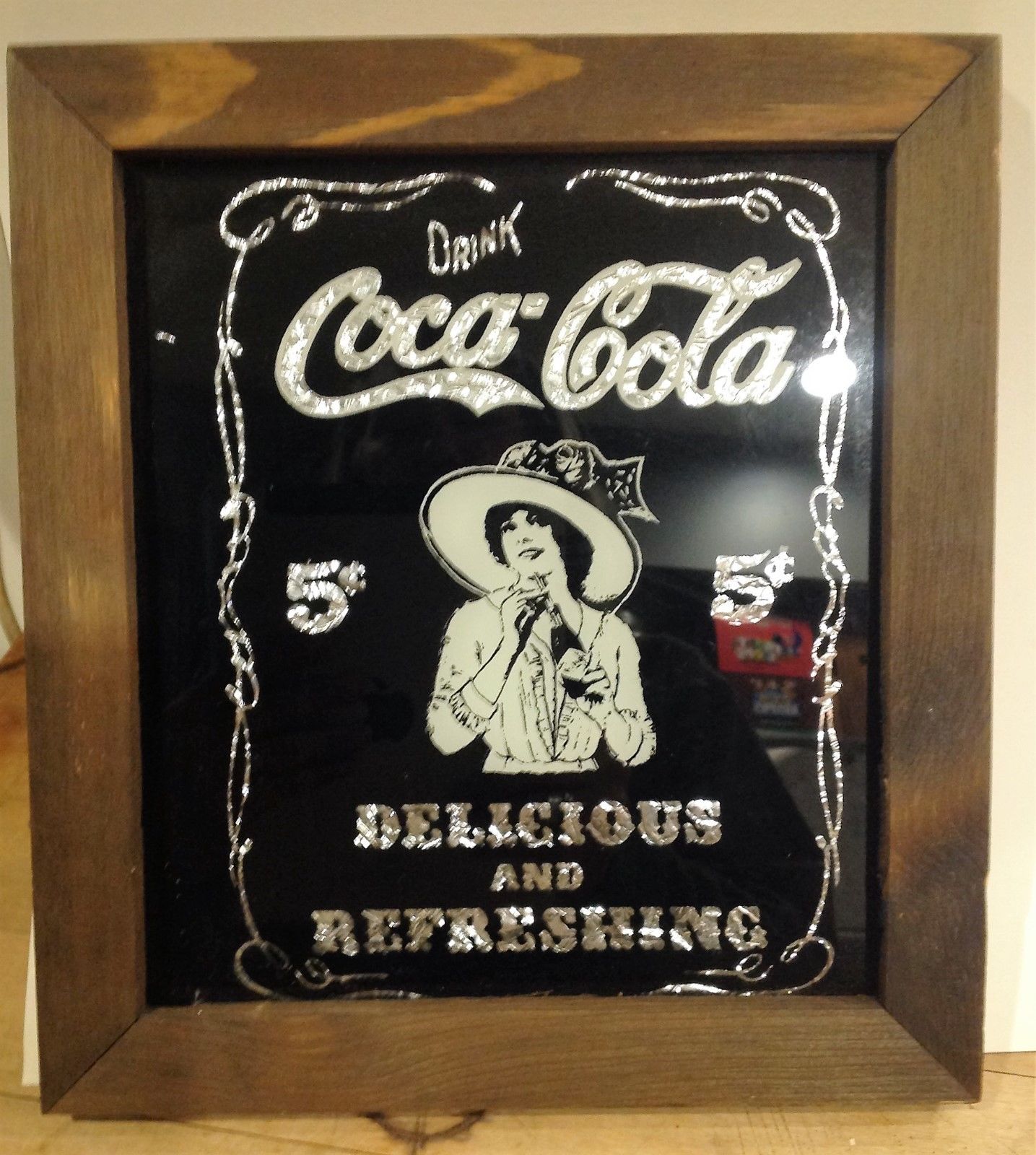 Vtg Drink Coca Cola 5c Delicious Silver Foil Black Glass Framed Bar Tavern Sign