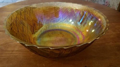 Title (ebay affiliate link): Iridescent Amber Serving Vegetable Bowl Depression Carnival Glass, Basket Weave