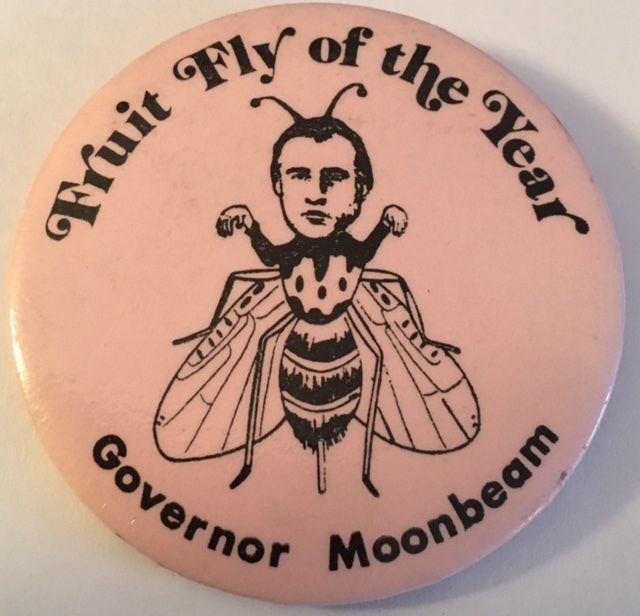 Title (ebay affiliate link): 2 1/2" Jerry Brown Governor Moonbeam Fruit Fly of the Year Pinback Button