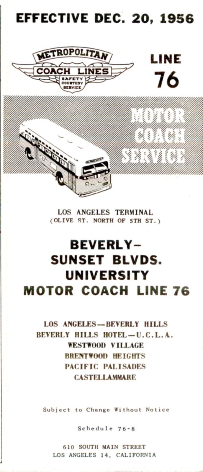 Metropolitan Coach Lines (P.E. RY) Coach, time table 76, Sunset-Univ 12-29-1956