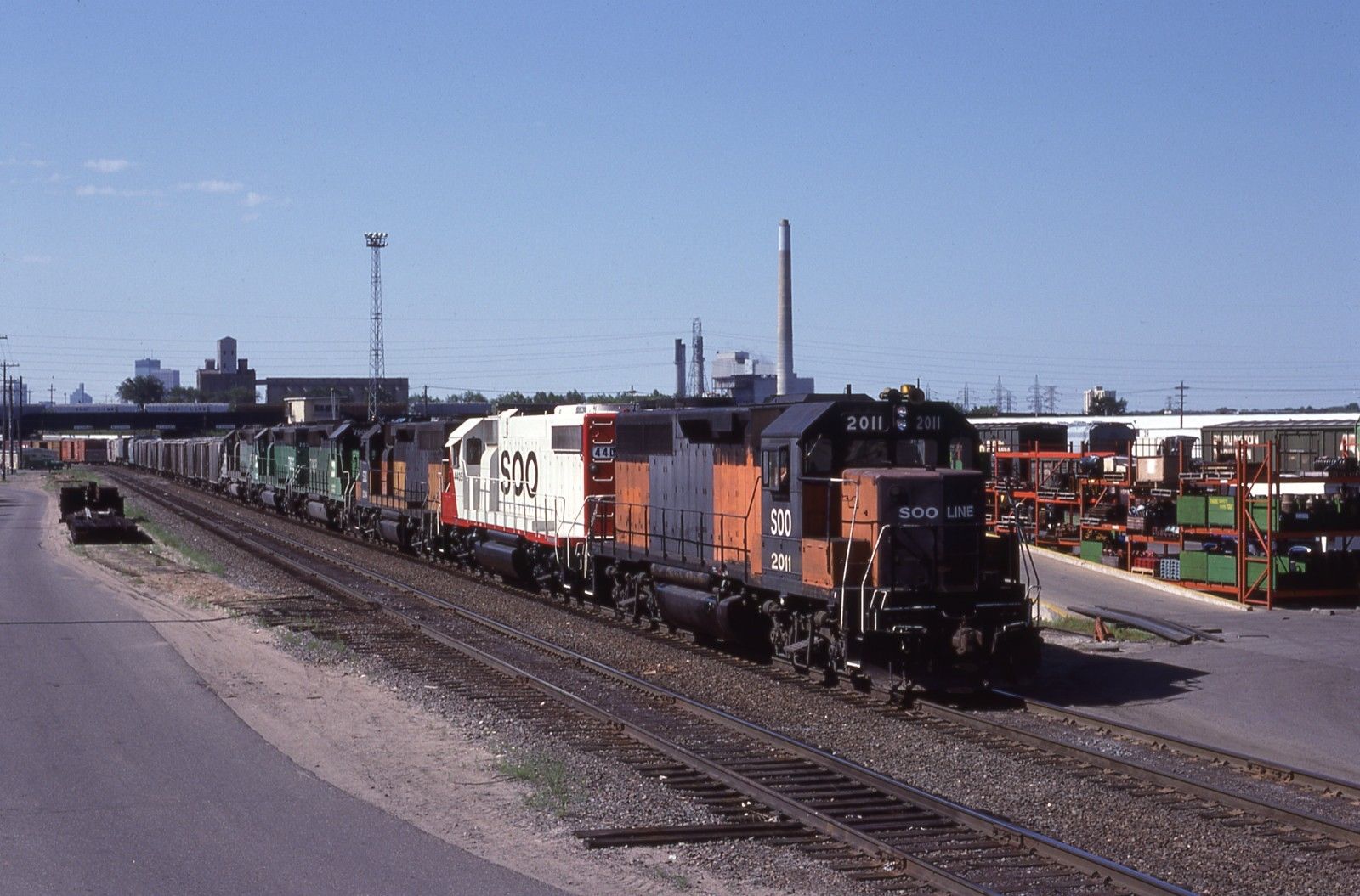 Original Slide SOO LINE GP40 #2011+5 w/Transfer @ Minneapolis MN - 1987 Ex-MILW