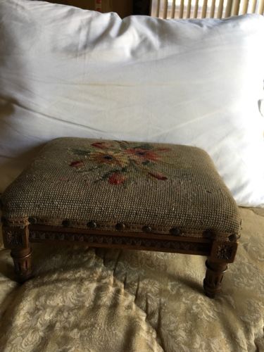 Antique Wooden Footstool With Needlepoint Cover