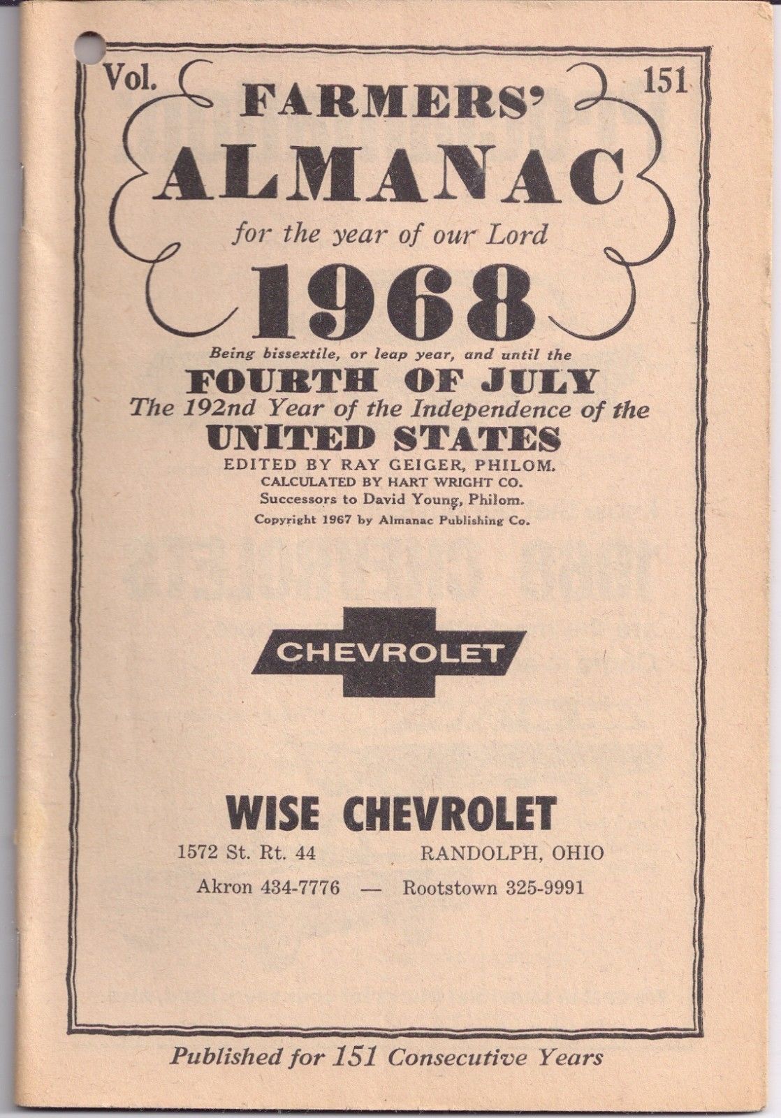 1968 Farmers Almanac Wise Chevrolet Randolph Ohio Ray Geiger Philom David Young