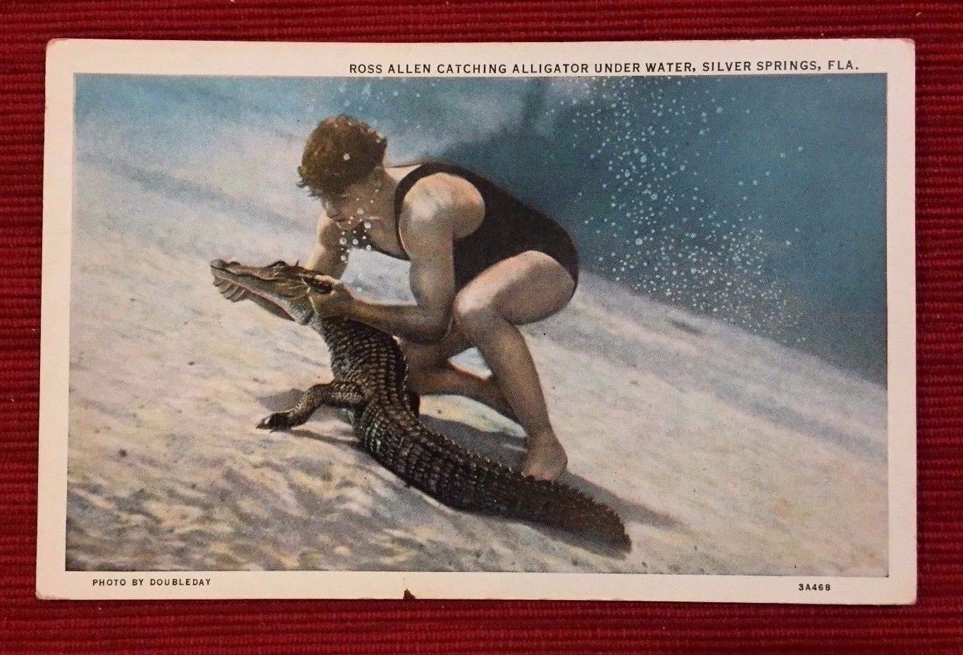 original postcard ROSS ALLEN CATCHING ALLIGATOR UNDER WATER Silver Springs FL