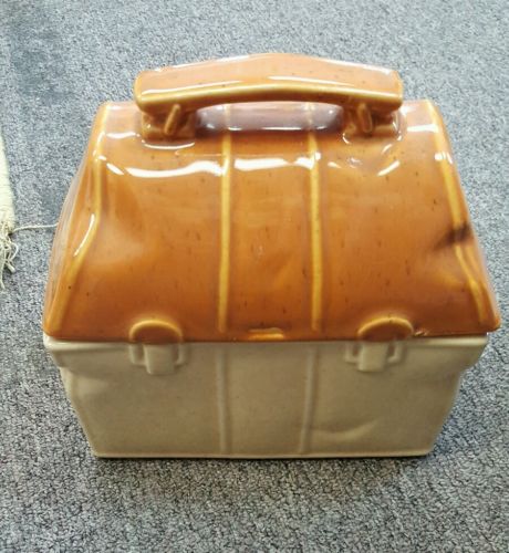 McCoy 1986 Ceramic Tan Brown lunchbox Cookie Jar ~ "352" and USA on bottom.