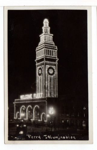 Title (ebay affiliate link): San Francisco CALIFORNIA Ferry Building at Night Real Photo c1919 "Welcome Fleet