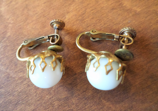 Title (ebay affiliate link): Authentic Miriam Haskell Signed, Milk Glass Beads, Screw/Clip on Earrings.