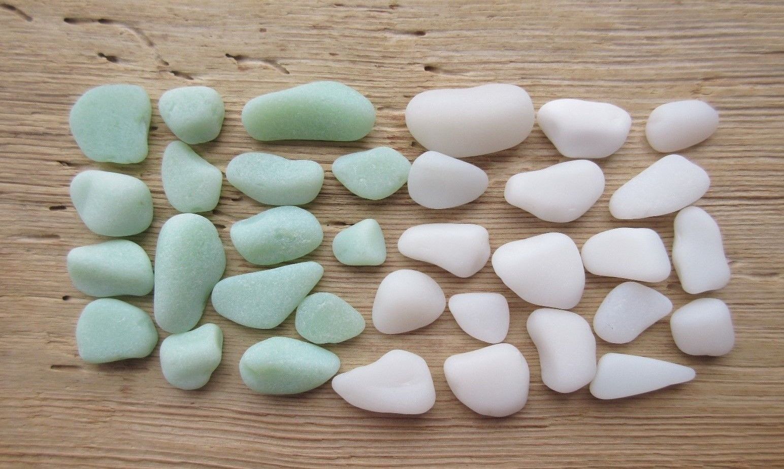 Title (ebay affiliate link): Sea Beach Glass. 34 pcs. Milk Glass & Jadeite. Surf-tumbled & rounded. Jewelry.