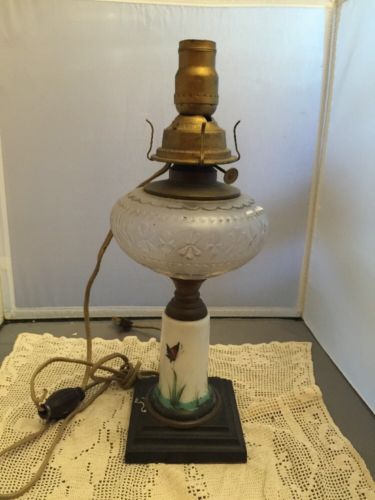 Title (ebay affiliate link): ANTIQUE PLUME & ATWOOD MILK GLASS BUTTERFLY BANQUET OIL LAMP CONVERTED