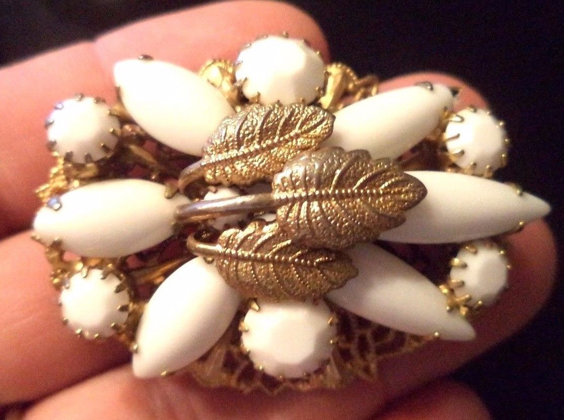 Title (ebay affiliate link): STUNNING VINTAGE ESTATE HIGH END MILK GLASS FLOWER 1 7/8" BROOCH MINTY!!! G2909