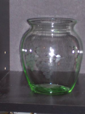 Title (ebay affiliate link): GREEN DEPRESSION GLASS VASE W GRAPES ETCHED 5" x 3.25"