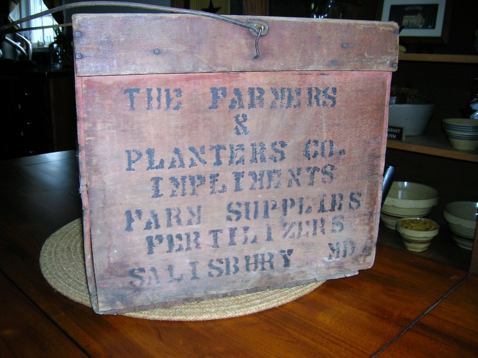 Title (ebay affiliate link): FARMERS & PLANTERS WOOD BOX CRATE SALISBURY, MD IMPLEMENTS FARM SUPPLIES HANDLE
