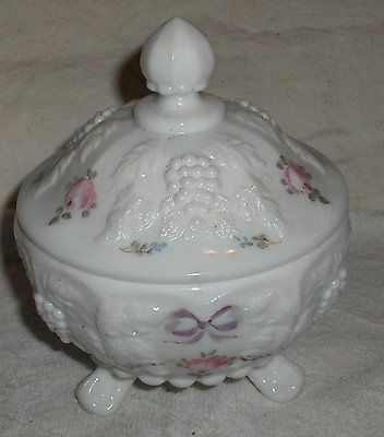 Title (ebay affiliate link): Vintage White Milk Glass Wedding Bowl Footed grapes and painted flowers
